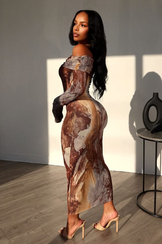 Embrace the allure of high fashion with our luxurious Off-Shoulder Midi Dress! With its unique marble print and figure-hugging silhouette, you’ll captivate every room you enter.